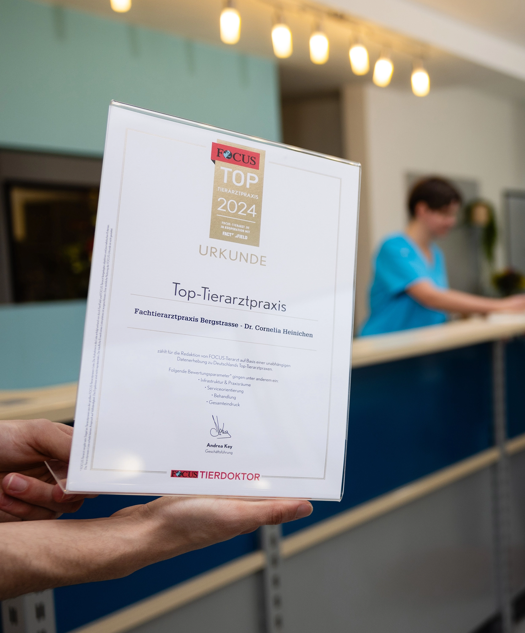 Unsere Praxis wurde bereits mehrfach mit dem FOCUS-Siegel ‚Top Tierarztpraxis Deutschlands‘ ausgezeichnet und trägt das Zertifikat ‚Service PLUS für Katzen‘ – eine Anerkennung für unsere hervorragende medizinische Qualität, moderne Ausstattung und besonders einfühlsame Betreuung, auch für unsere sensibelsten Patienten.
